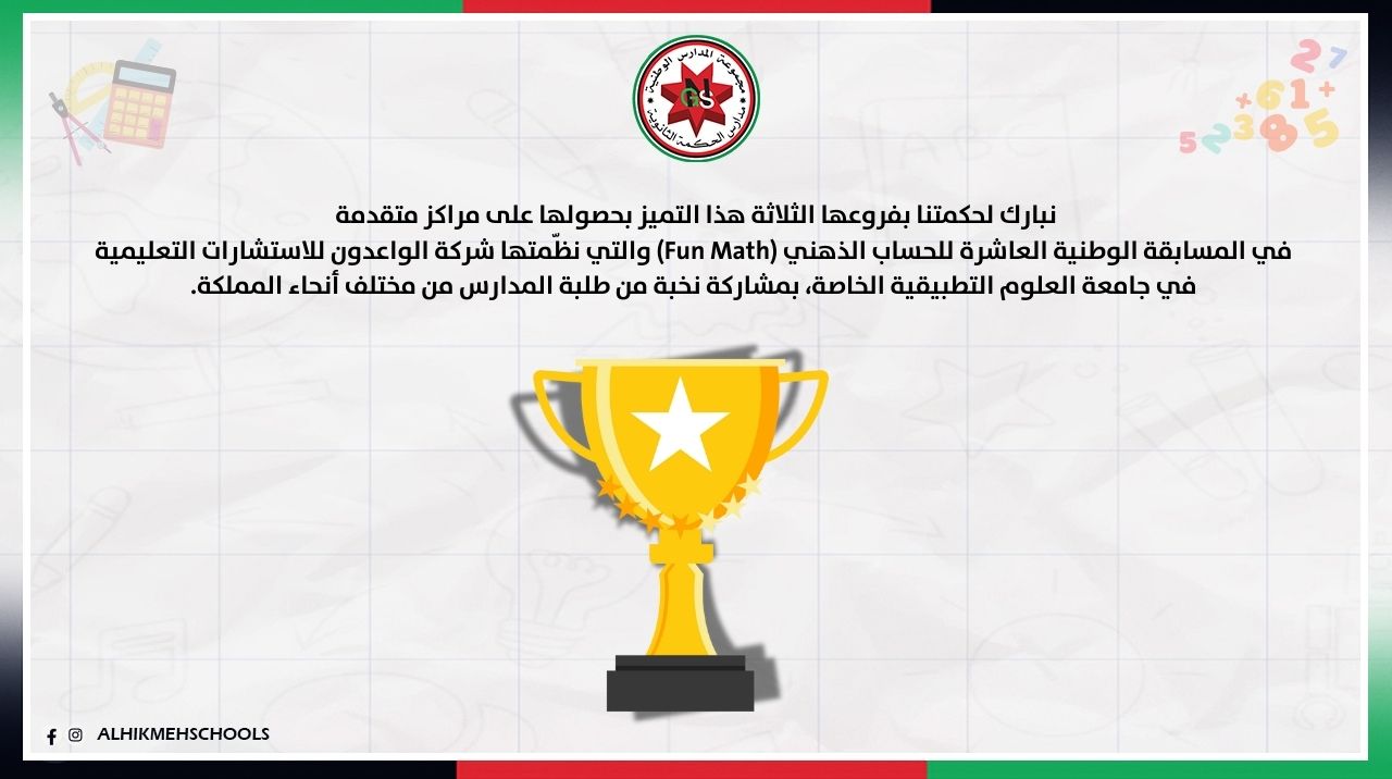 عمون - هنأت مدارس الحكمة فروعها الثلاث بحصولها على مراكز متقدمة في المسابقة الوطنية العاشرة للحساب الذهني (Fun Math)والتي نظّمتها شركة الواعدون للاستشارات التعليمية في جامعة العلوم التطبيقية الخاصة، بمشاركة نخبة من طلبة المدارس. |