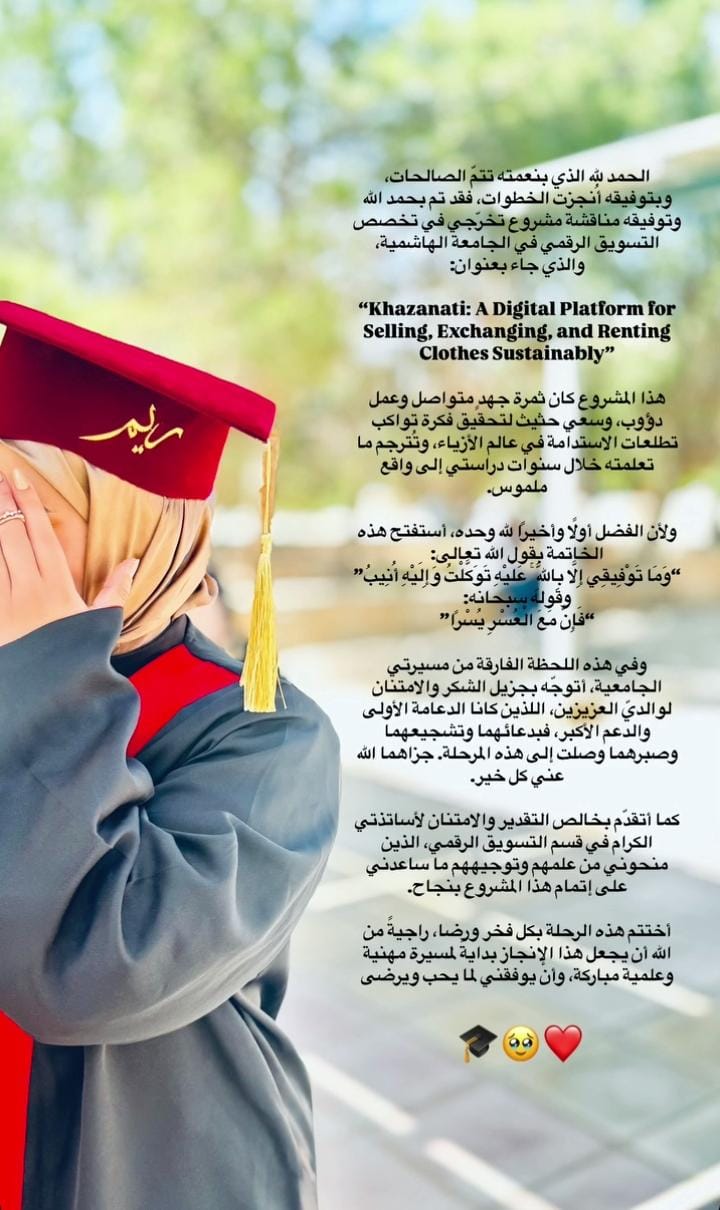 عمون - هنأت الكاتبة فرح محمود الحواتمة صديقة الطفولة ريم ابراهيم الحواتمة بمناسبة مناقشة مشروع تخرجها المتميز تحت عنوان: "خزانتي – Khazanati: Sustainable Clothing Platform: Buy, Rent, Exchange, and Donate Clothes for Free". |