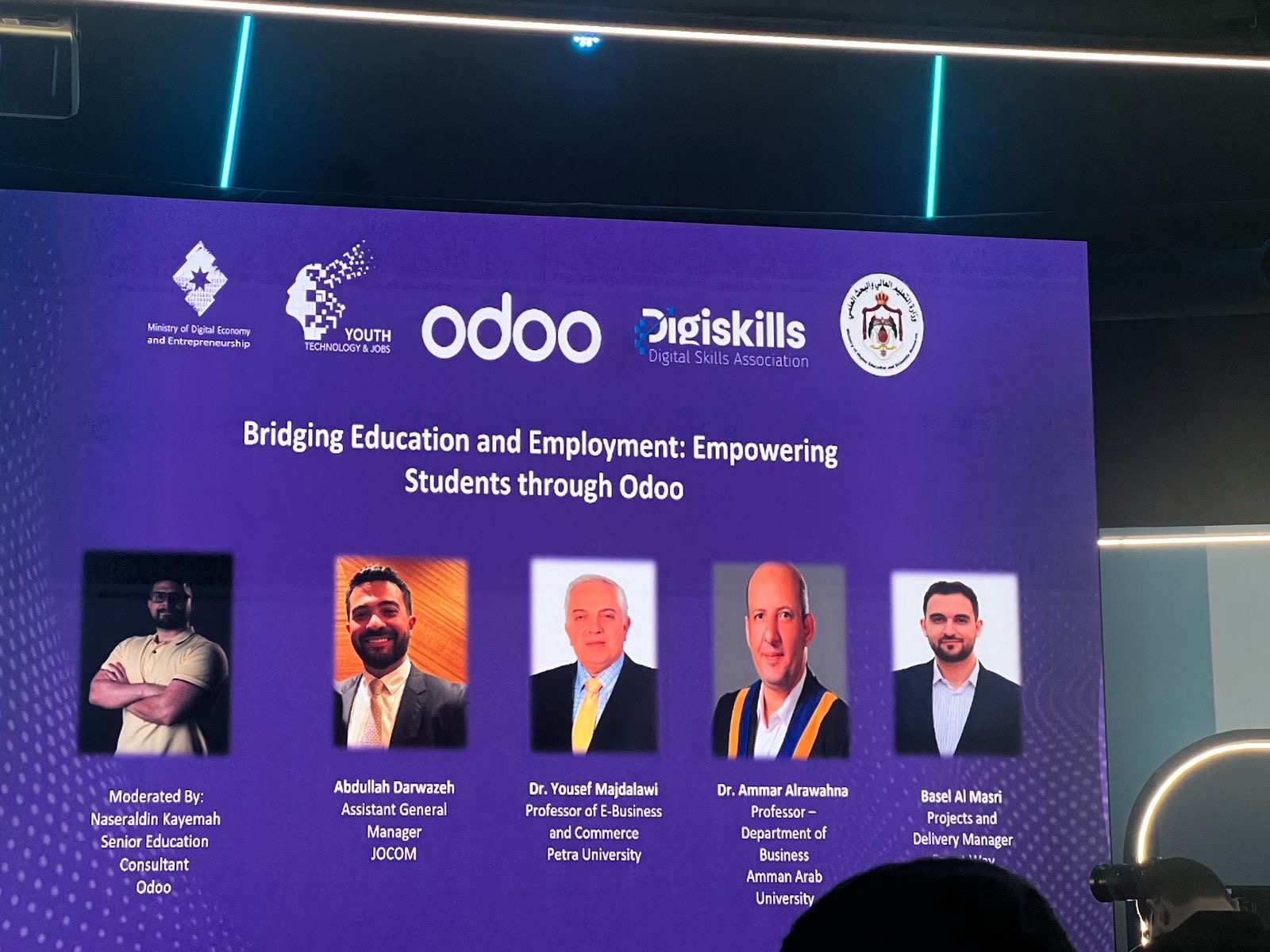 ومثّل جامعة عمان العربية في فعالية إطلاق برنامج Odoo التعليمي الدكتور عمار الرواحنة، عضو هيئة التدريس في كلية الأعمال، كمتحدث رئيسي خلال الجلسة الحوارية، مستعرضاً تجربة جامعة عمان العربية الرائدة في دمج برنامج Odoo ضمن الخطط الأكاديمية لكلية الأعمال، موضحًا أن هذا التوجه ساعد الطلبة على ربط الجانب النظري بالتطبيقي، مما مكنهم من الاستعداد العملي لسوق العمل الرقمي المتغير، مؤكداً على أن هذه المبادرة تأتي ضمن الجهود المستمرة للجامعة لمواكبة التطورات التكنولوجية، وتزويد الطلبة بالمهارات اللازمة لتأهيلهم لسوق العمل الرقمي المتسارع، مضيفاً بأن دمج برنامج Odoo يسهم في تمكين الطلبة من استخدام أدوات ERP المتقدمة، مما يعزز من فرصهم التنافسية في السوق المحلي والإقليمي.
