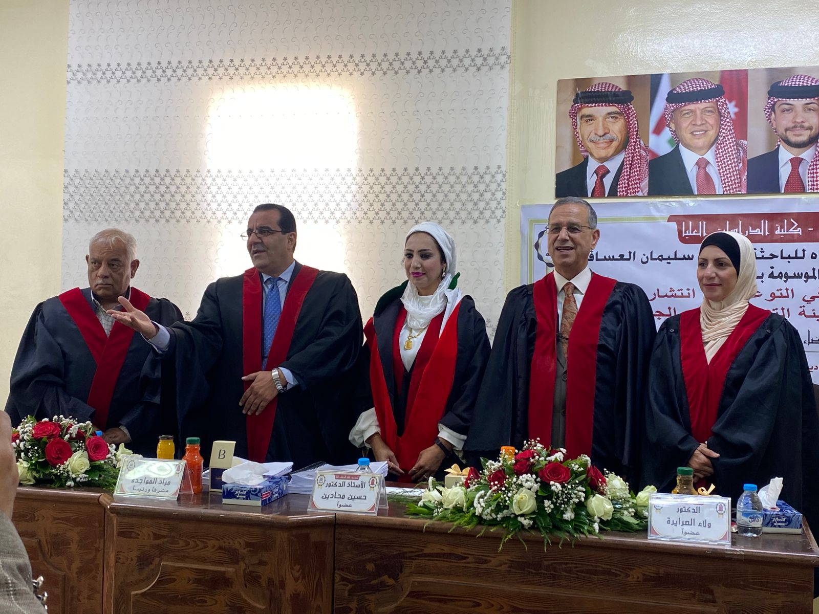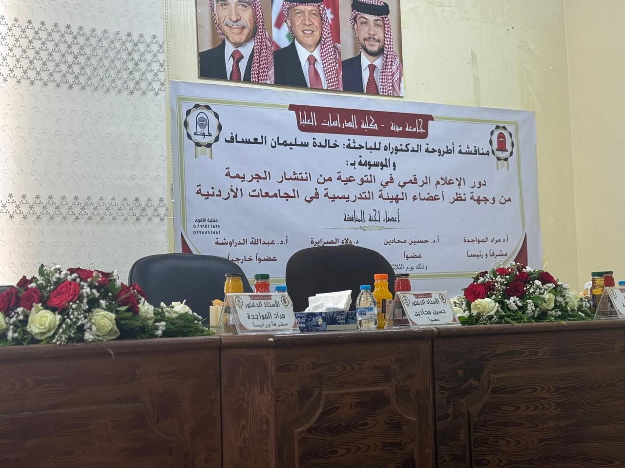 وتألفت لجنة المناقشة من الاستاذ الدكتور مراد المواجدة مشرفا ورئيساً ، والاستاذ الدكتور حسين المحادين عضواً ، والدكتورة ولاء الصرايرة عضواً ، والاستاذ الدكتور عبدالله الداروشة عضواً خارجياً