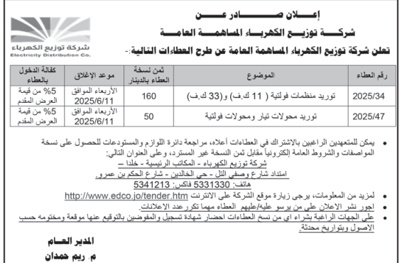 عطاءات صادرة عن شركة توزيع الكهرباء