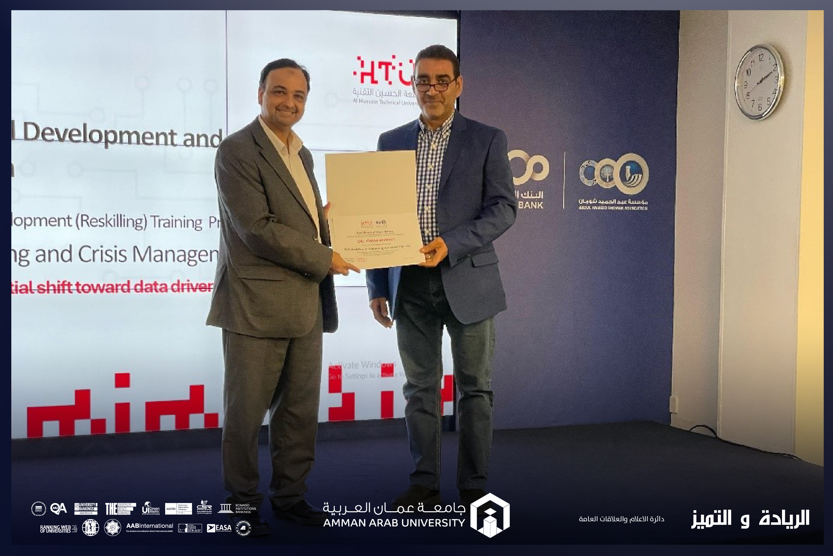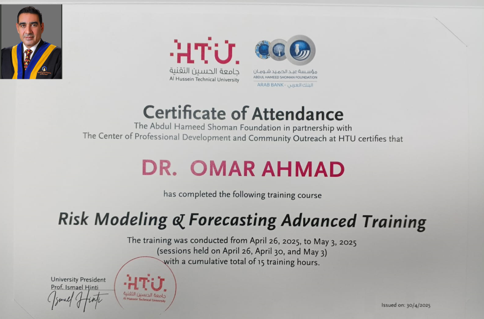 عمون - ضمن إطار سعي جامعة عمان العربية المستمر لتعزيز مهارات أعضاء هيئة التدريس في مجال البحث العلمي والتقنيات الحديثة وبتوجيهات من الأستاذ الدكتور محمد الوديان رئيس الجامعة، شارك الدكتور عمر أسعد عضو هيئة التدريس في كلية الهندسة في دورة تدريبية متقدمة بعنوان "نمذجة المخاطر والتنبؤ بها" (Risk Modeling and Forecasting Advanced Training)، بتنظيم من جامعة الحسين التقنية وبالتعاون مع مؤسسة عبد الحميد شومان.