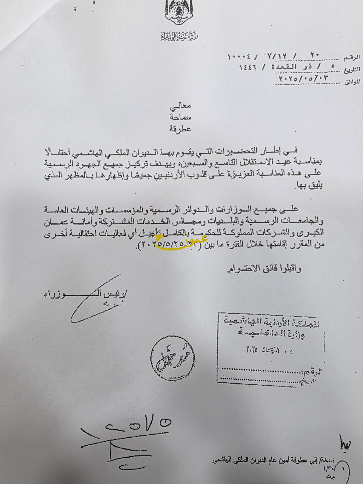 عمون - ينال المعاني - اوعز رئيس الوزراء الدكتور جعفر حسان بتأجيل اي فعاليات احتفالية من المقرر إقامتها خلال الفترة ما بين (23-25/ 5 / 2025) لغايات التحضيرات التي يقوم بها الديوان الملكي الهاشمي احتفالا بمناسبة عيد الاستقلال التاسع والسبعين. |