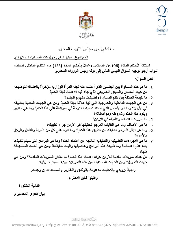 وتساءلت المحسيري عن ماهية هذا الختم، ومصدره، والسياق القانوني والتشريعي الذي تم اعتماده ضمنه، إضافة إلى طبيعة العلاقة بين الختم ومفهوم "الجندر"، مطالبة بتوضيح الجهات المحلية والدولية المرتبطة به، والمعايير والبنود التي يقوم عليها، وأسس موافقة الحكومة على اعتماده، ومبررات تطبيقه في الأردن، والأهداف والغايات المرجوة من استخدامه، والأثر المتوقع على فئات المجتمع المختلفة من نساء وأطفال ورجال وأسر.