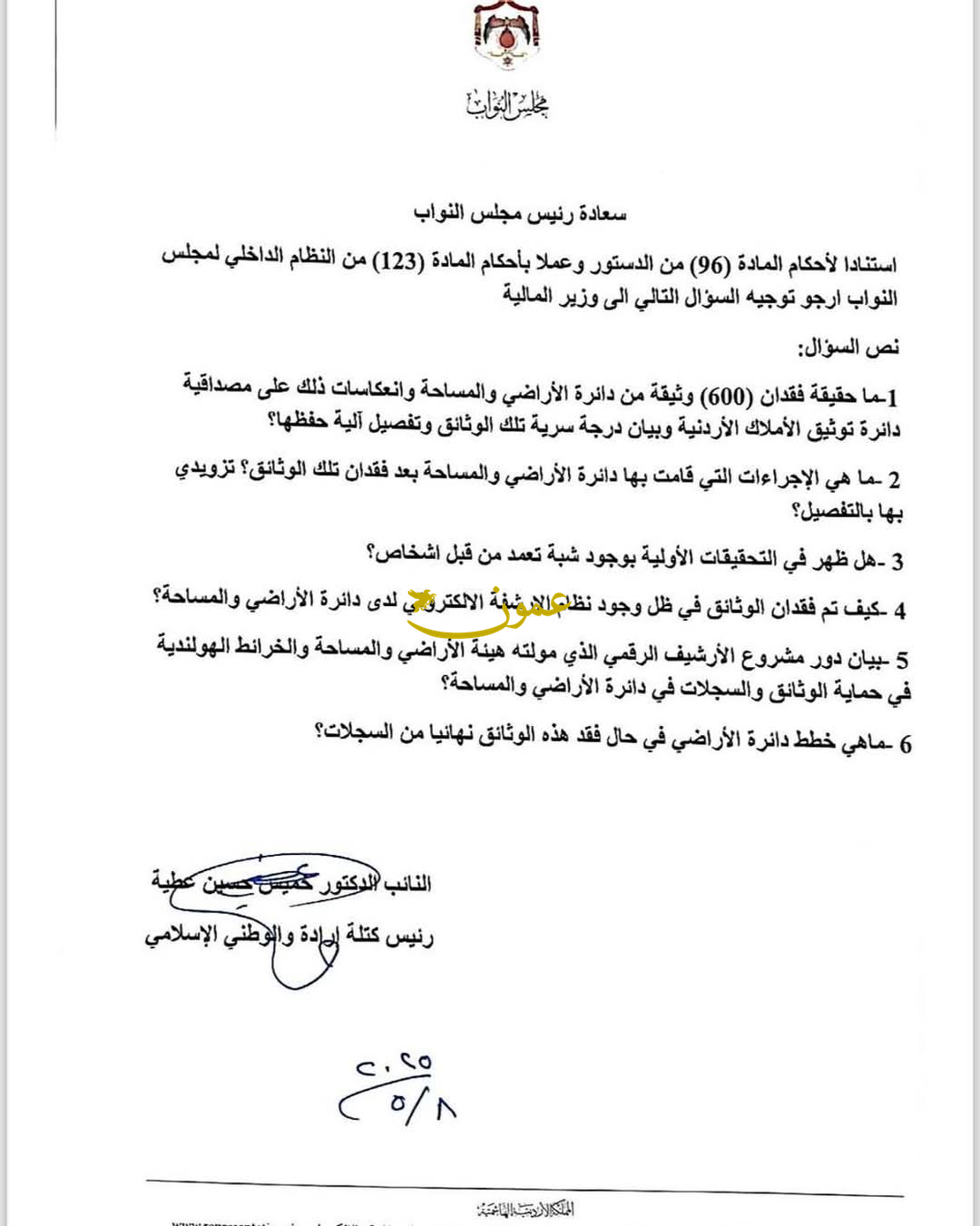 عمون - وجه النائب خميس عطية رئيس كتلة إرادة والوطني الاسلامي النيابية، سؤالا إلى وزير المالية، حول فقدان 600 وثيقة من دائرة الاراضي والمساحة. |