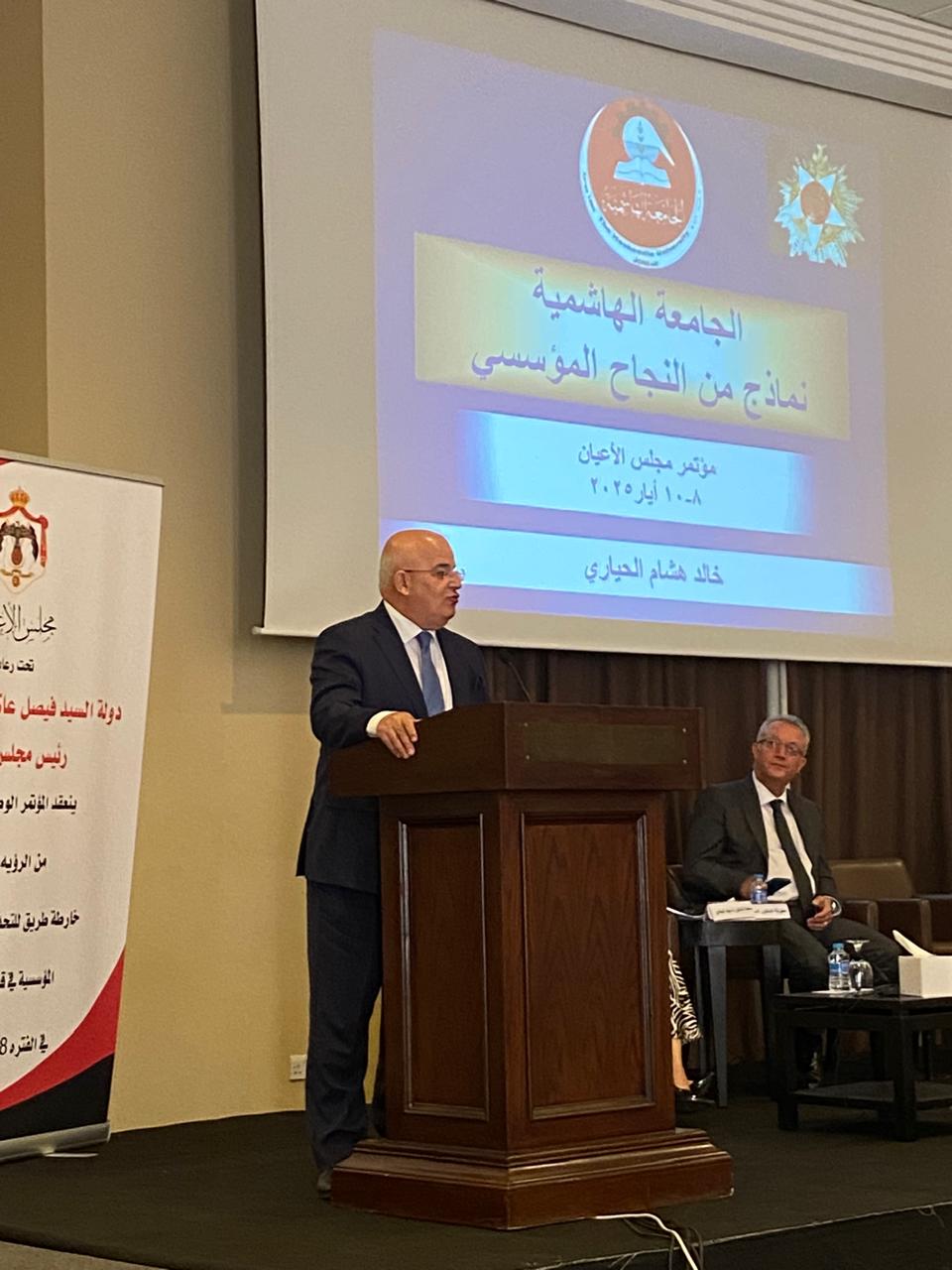 وقدم الدكتور الحياري في الجلسة الرابعة في محور "قصص نجاح مؤسسية"، انجازات الجامعة الهاشمية التي اثمرت عن تحولات نوعية شهدتها الجامعة، عمقت من دورها الوطني والمجنمعي، وساهمت في تعزيز مكانتهتا العلمية والبحثيىة، وحسنت من كفاءة الاداء الاداري والخدمي، وخاصة فيما يتعلق في مساهمة الجامعة في المشاريع الوطنية الاستراتيجية ، ودعم الابحاث العلمية النوعية، وتطوير مشاريع الاستدامة البيئية والمالية.