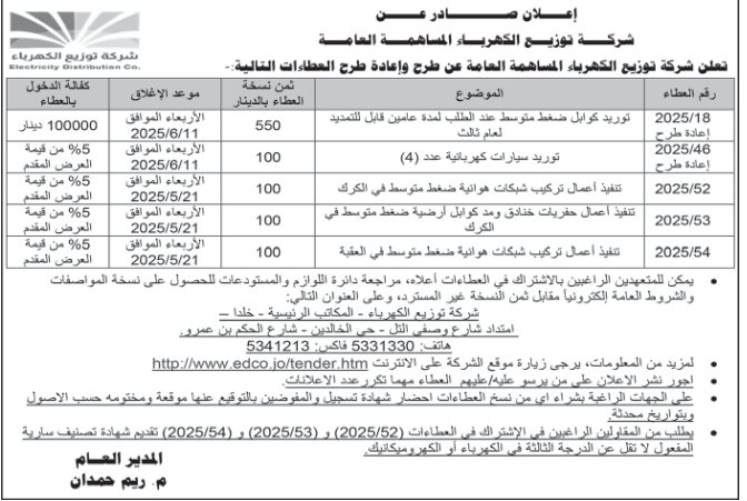 عطاءات صادرة عن شركة توزيع الكهرباء