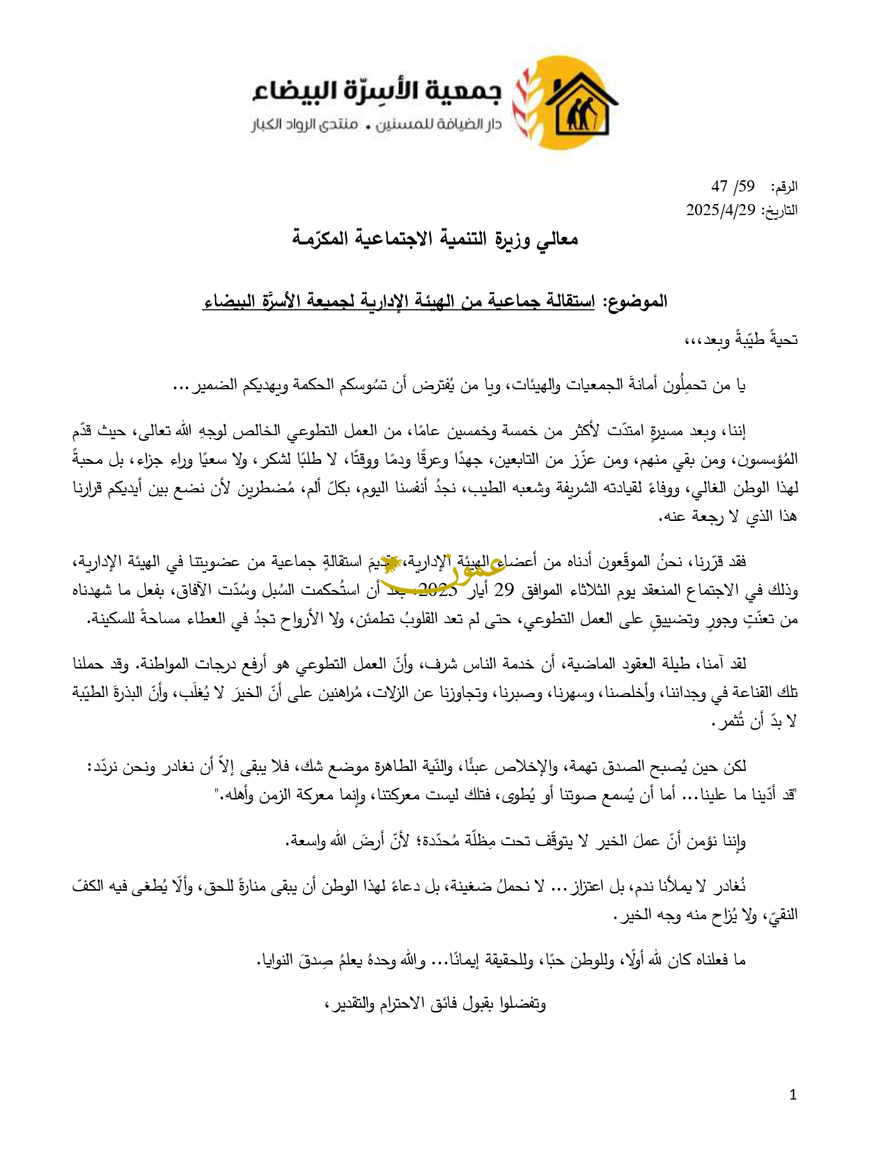 "لقد آمنا، طيلة العقود الماضية، أن خدمة الناس شرف، وأن العمل التطوعي هو أرفع درجات المواطنة... لكن حين يُصبح الصدق تهمة، والإخلاص عبئًا، والنّية الطاهرة موضع شك، فلا يبقى إلا أن نغادر ونحن نردّد: قد أدّينا ما علينا... إما أن يُسمع صوتنا أو يُطوى، فتلك ليست معركتنا، وإنما معركة الزمن وأهله."