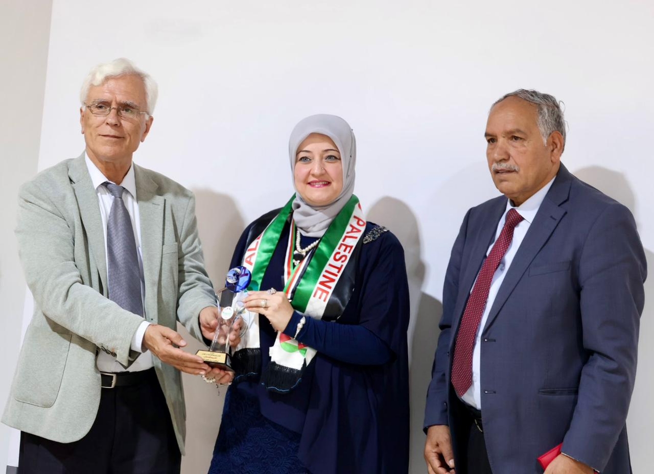 عمون - سلّم د. طلال أبو عفيفة رئيس ملتقى المثقّفين المقدسيّ الأديبة الأردنيّة ذات الأصول الفلسطينيّة أ. د. سناء الشّعلان (بنت نعيمة) جائزة مهرجان زهرة المدائن للإبداع الثّقافيّ من أجل القدس عن مجموعتها القصصيّة (تقاسيم الفلسطينيّ) للعام 2025 في الدّورة الثّامنة عشرة له التي تُعنى بكلّ عمل إبداعيّ لنصرة القدس وفلسطين، وبكلّ مَنْ أسهموا في دعم القضيّة الفلسطينيّة والدّفاع عن القدس من خلال أعمالهم الأدبيّة والثقافيّة.