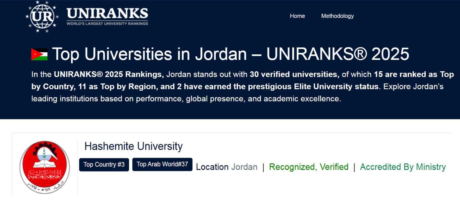 ويهدف تصنيف UNIRANKS إلى تقييم الجامعات عالميا باستخدام معايير شاملة وديناميكية، وشملت 37,470 جامعة لعام 2025 من مختلف دول العالم وبمشاركة 30 جامعة أردنية، بناءً على معايير أساسية ترتكز على احتياجات الطلبة وجاهزية الخريجين لسوق العمل، والجودة الأكاديمية، والتحول الرقمي، والسمعة العالمية، والابتكار، والخبرة والفرص والاستعداد للمستقبل الذي توفره للطلبة ويتم تحديث التصنيف سنويا ليعكس التطورات في الأداء الأكاديمي والمؤسسي.