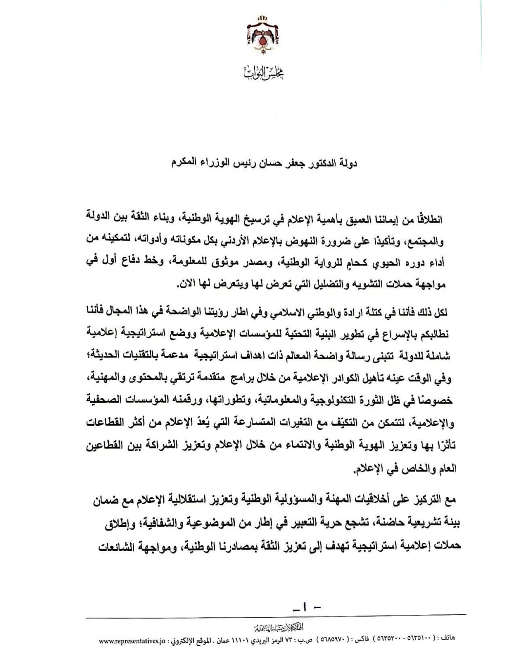 انطلاقًا من إيماننا العميق بأهمية الإعلام في ترسيخ الهوية الوطنية، وبناء الثقة بين الدولة والمجتمع، وتأكيدًا على ضرورة النهوض بالإعلام الأردني بكل مكوناته وأدواته، لتمكينه من أداء دوره الحيوي كـحامٍ للرواية الوطنية، ومصدر موثوق للمعلومة، وخط دفاع أول في مواجهة حملات التشويه والتضليل التي تعرض لها ويتعرض لها الان.