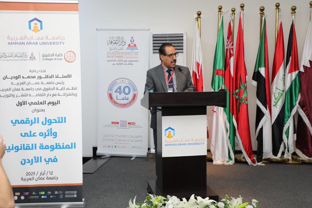 بدوره أشار الدكتور سلطان العطين رئيس قسم القانون في كلية الحقوق في جامعة عمان العربية إلى أهمية عنوان اليوم العلمي وعمقه في تسليط الضوء على أحد أبرز التحولات المعاصرة التي تمس مختلف جوانب المنظومة القانونية، مؤكداً على أن مواكبة هذا التحول الرقمي يتطلب جهدًا علميًا مشتركًا بين الجهات الأكاديمية والتشريعية، كما أعلن عن السير في إجراءات توقيع مذكرة تفاهم مع اللجنة القانونية في مجلس النواب والتي تهدف إلى تفعيل دور البحث القانوني في دعم صناعة التشريع من خلال تقديم الدراسات العلمية والمقترحات القانونية التي تُسهم في تطوير البيئة التشريعية بما ينسجم مع متطلبات العصر الرقمي .