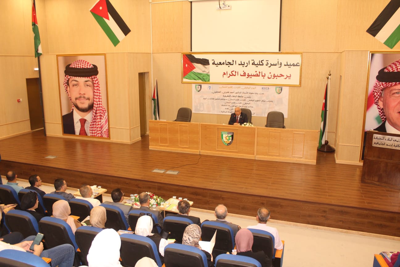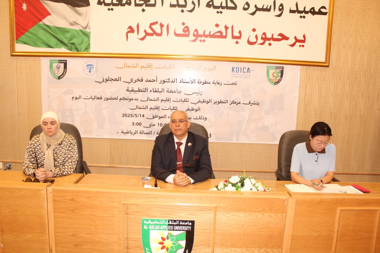 عمون - برعاية رئيس جامعة البلقاء التطبيقية الأستاذ الدكتور أحمد فخري العجلوني، ونيابة عنه، رعى الأستاذ الدكتور يحيا سلامه خريسات، مدير مركز التطوير الوظيفي لكليات إقليم الشمال وعميد كلية إربد الجامعية، فعاليات اليوم الوظيفي الذي نظمه المركز في حرم كلية إربد الجامعية، وبدعم وتمويل من الوكالة الكورية للتعاون الدولي (KOICA).