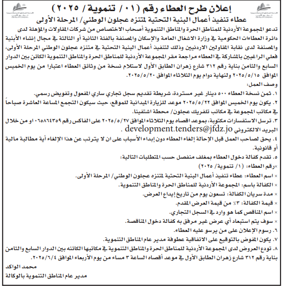 عطاء صادر عن المجموعة الاردنية للمناطق الحرة والمناطق والتنموية