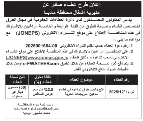 عطاء فتح وتعبيد طرق زراعية في قضاء ماعين