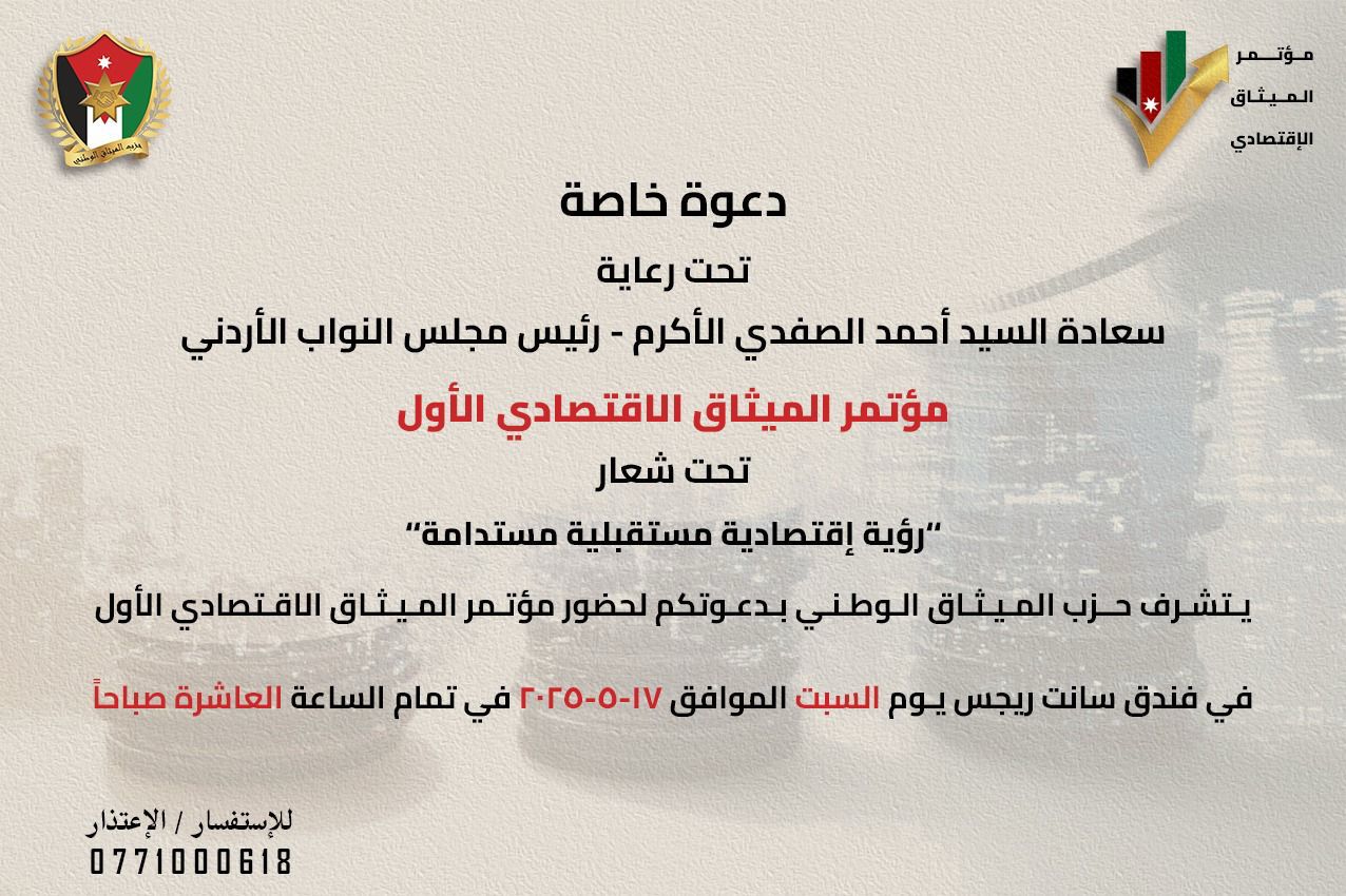 عمون - تحت رعاية رئيس مجلس النواب أحمد الصفدي، ينظم حزب الميثاق الوطني "مؤتمر الميثاق الاقتصادي الأول"، وذلك يوم السبت الموافق 17 أيار 2025، في تمام الساعة العاشرة صباحًا، في فندق سانت ريجس – عمّان. |