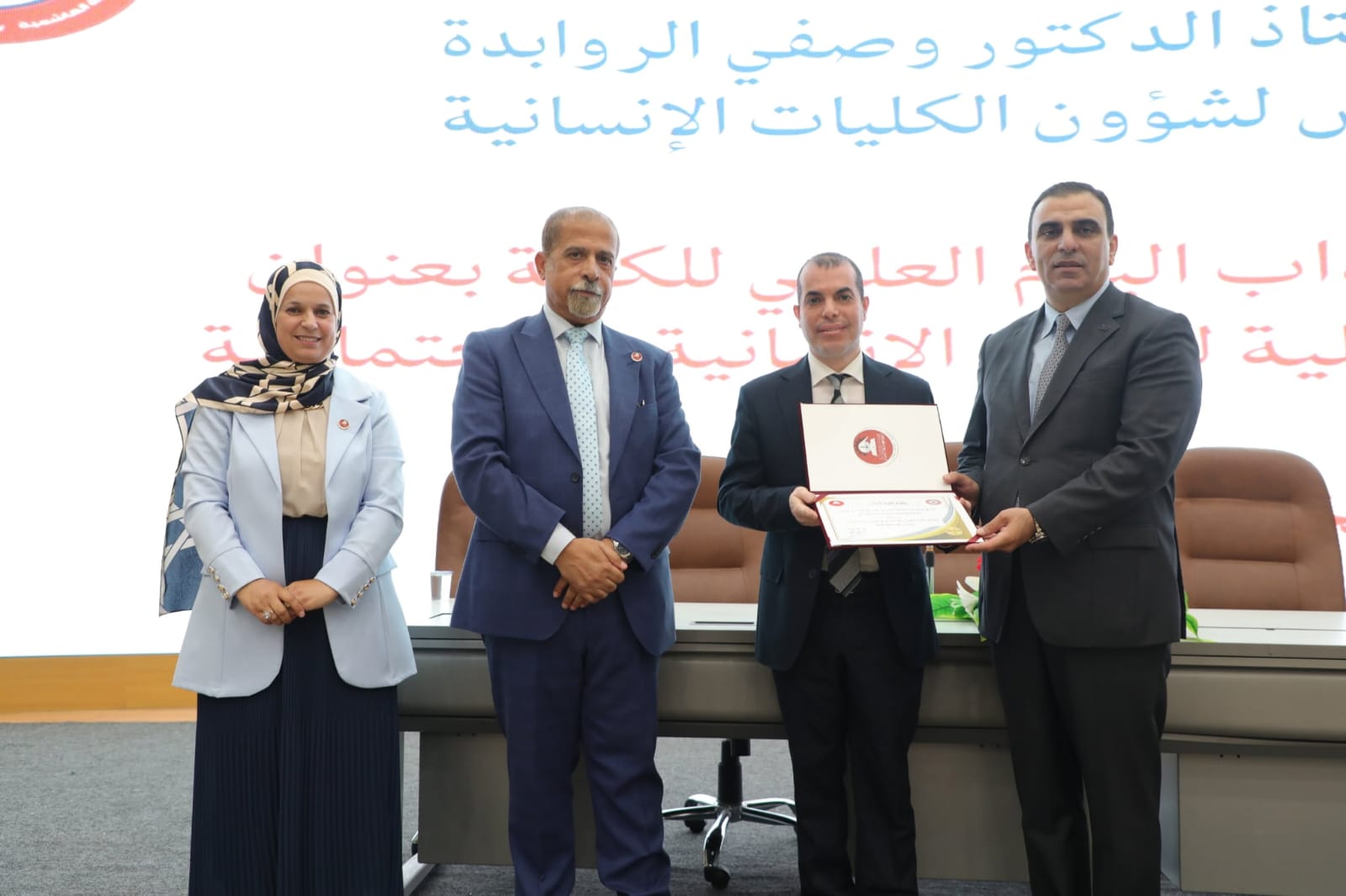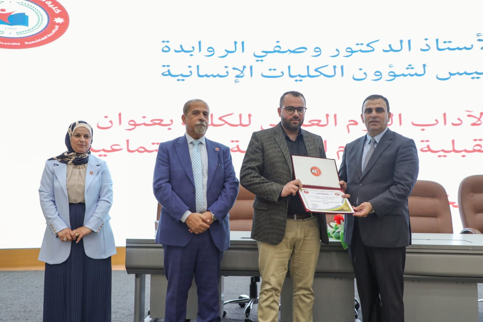 من جهته، أوضح عميد كلية الآداب الأستاذ الدكتور يحيى العلي أن الكلية تسعى لمواكبة التحولات المعرفية المتسارعة من خلال تحديث برامجها الأكاديمية وتطوير مخرجاتها البحثية، مؤكدًا أن العلوم الإنسانية والاجتماعية تشكل ركيزة أساسية في بناء المجتمعات وتعزيز القيم المشتركة، ومشيرا إلى استحداث الكلية لمختبر تحليل الخطاب كمنصة بحثية متخصصة تُعنى بتحليل الخطاب من جوانبه الأيديولوجية والسياسية والاجتماعية والإعلامية، كما لفت إلى فوز عدد من أعضاء الهيئة التدريسية بجوائز دولية، ومشاركتهم في لجان وهيئات ثقافية وعلمية عالمية.