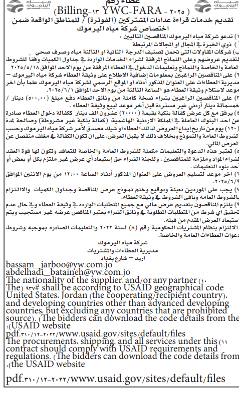 عطاء صادر عن شركة مياه اليرموك