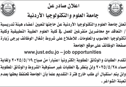 جامعة العلوم والتكنولوجيا الاردنية بحاجة لتعيين اعضاء هيئة تدريسة