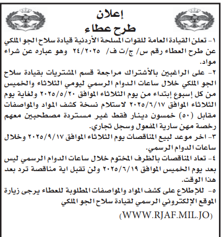 عطاء صادر عن القيادة العامة للقوات المسلحة الاردنية