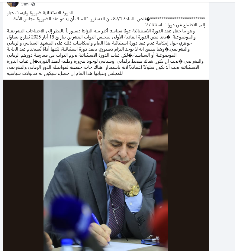 وقال الزعبي في منشور له عبر موقع التواصل الاجتماعي فيسبوك، إنّ غياب الدورة الاستثنائية يجب أن لا يكون سلوكًا اعتياديًا لانه باستمرار هناك حاجة حقيقية لمواصلة الدور الرقابي والتشريعي للمجلس وغيابها إن حصل سيكون له مدلولات سياسية.