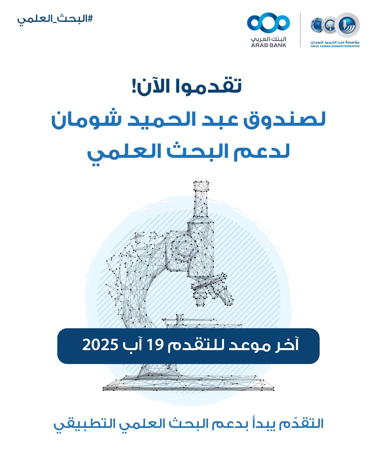 عمون - أعلنت مؤسسة عبد الحميد شومان/ ذراع البنك العربي للمسؤولية الثقافية والاجتماعية، عن البدء باستقبال طلبات التقدم للحصول على تمويل من صندوق عبد الحميد شومان لدعم البحث العلمي للعام الحالي 2025.