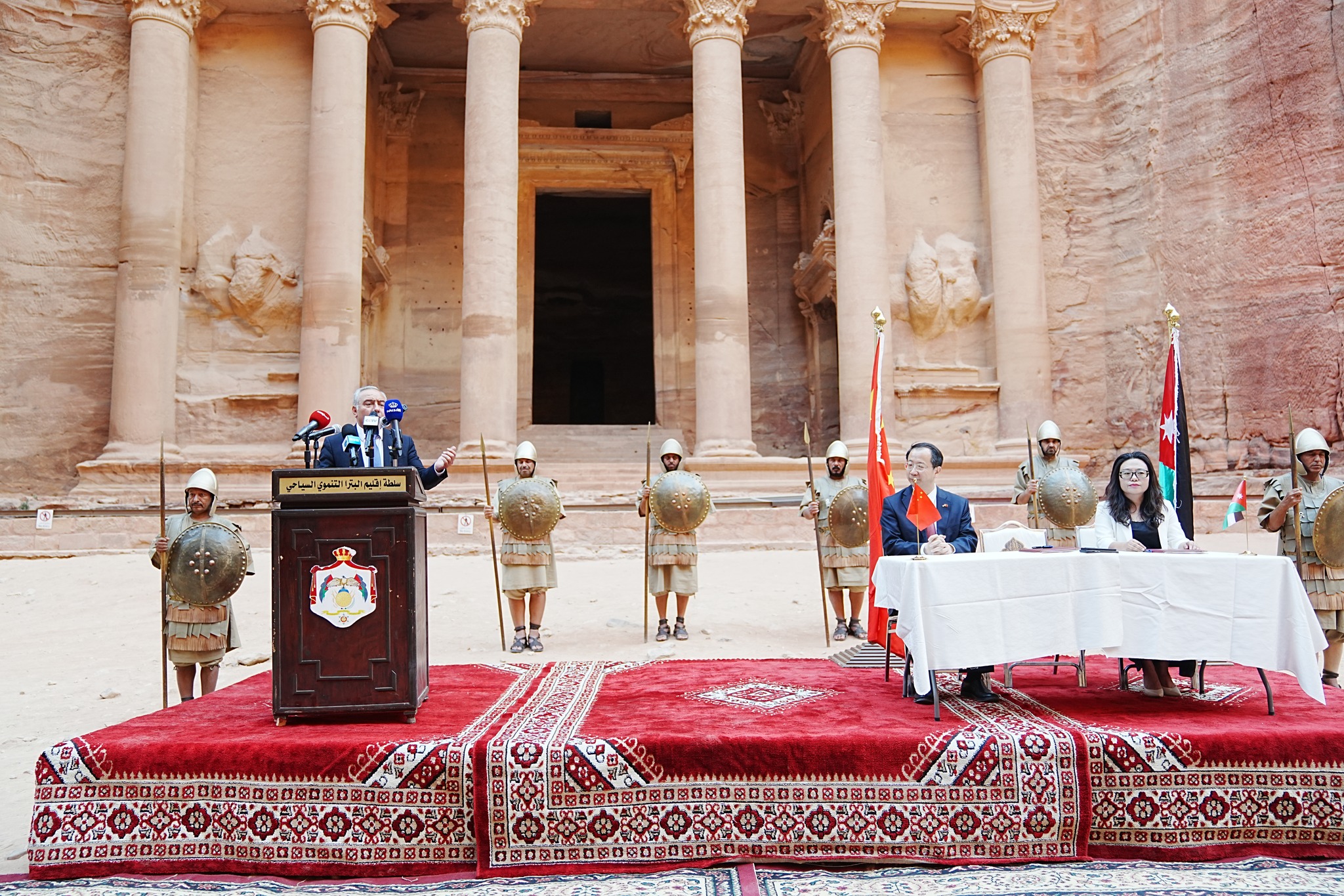 ووقّع الاتفاقية رئيس مجلس مفوضي سلطة إقليم البترا التنموي السياحي الدكتور فارس البريزات، ومديرة مكتب الثقافة والسياحة في بلدية جيايوغوان تشاو شومين، لتعزيز الروابط بين البلدين وتبادل الخبرات في مختلف القطاعات الحيوية، بحضور السفير الصيني في الاردن تشن تشوان دونغ، والسفير الاسباني في الأردن ميغيل دي لوكاس، وعدد من المسؤولين الحكوميين، وممثلي المجتمع المحلي في البترا.