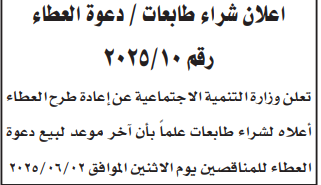عطاء شراء طابعات لوزارة التنمية الاجتماعية