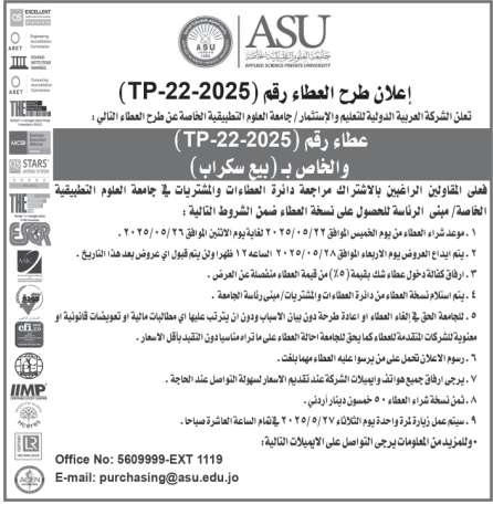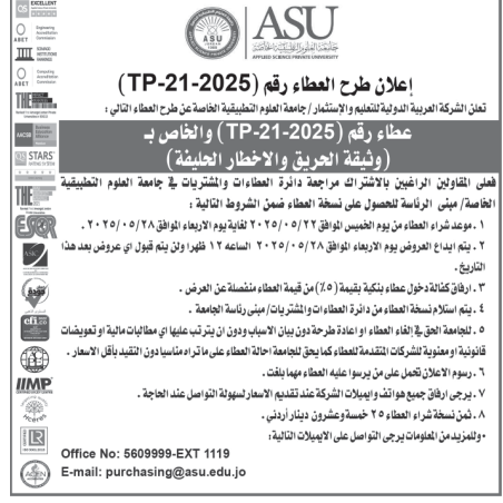 عطاءات صادرة عن جامعة العلوم التطبيقية الخاصة