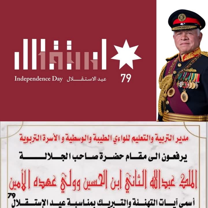 عمون - تتقدم الأسرة التربوية في مديرية التربية والتعليم للواءي الطيبة والوسطية ممثلةً بمديرها، الدكتور رعد الخصاونة ، بأسمى آيات التهنئة والتبريك إلى مقام حضرة صاحب الجلالة الهاشمية الملك عبدالله الثاني ابن الحسين، وولي عهده الأمين ، بمناسبة ذكرى عيد الاستقلال التاسع والسبعين للمملكة الأردنية الهاشمية. |