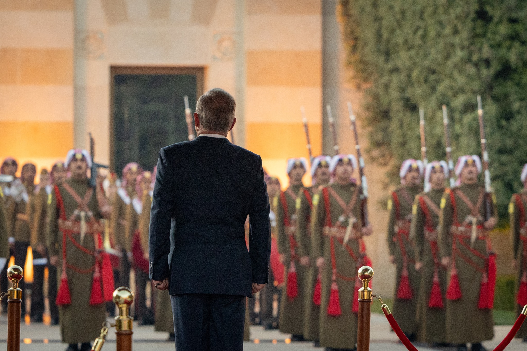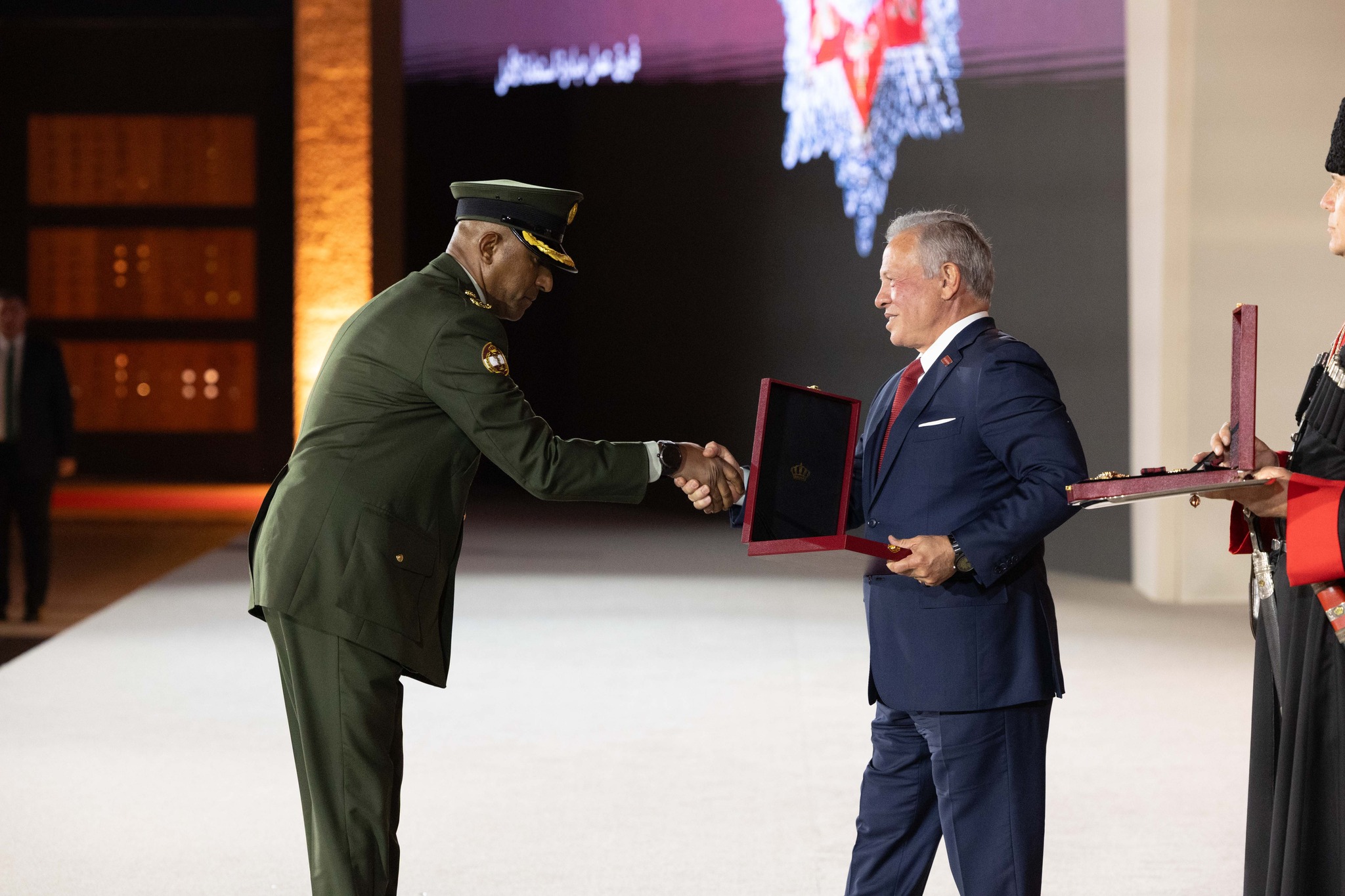 ولدى وصول جلالة الملك إلى موقع الحفل محاطا بالموكب الأحمر، أطلقت المدفعية 21 طلقة تحية لجلالته، فيما استعرض جلالته حرس الشرف الذي اصطف لتحيته، وعزفت الموسيقى السلام الملكي.