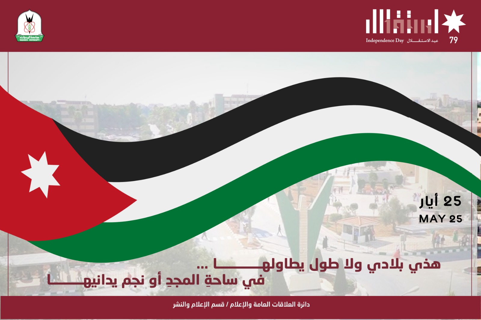 عمون - يتشرف رئيس جامعة اليرموك الدكتور إسلام مسّاد، وأسرة الجامعة من أعضاء الهيئتين التدريسية والإدارية والطلبة، أن يرفعوا إلى مقام صاحب الجلالة الهاشمية الملك عبد الله الثاني ابن الحسين المعظم، وسمو ولي العهد الأمين الأمير الحسين بن عبد الله الثاني المعظم، أصدق معاني التهنئة والمباركة المقرونة بالولاء للعرش الهاشمي المفدى والانتماء لثرى الأردن الطهور، بمناسبة عيد الاستقلال الـ 79.