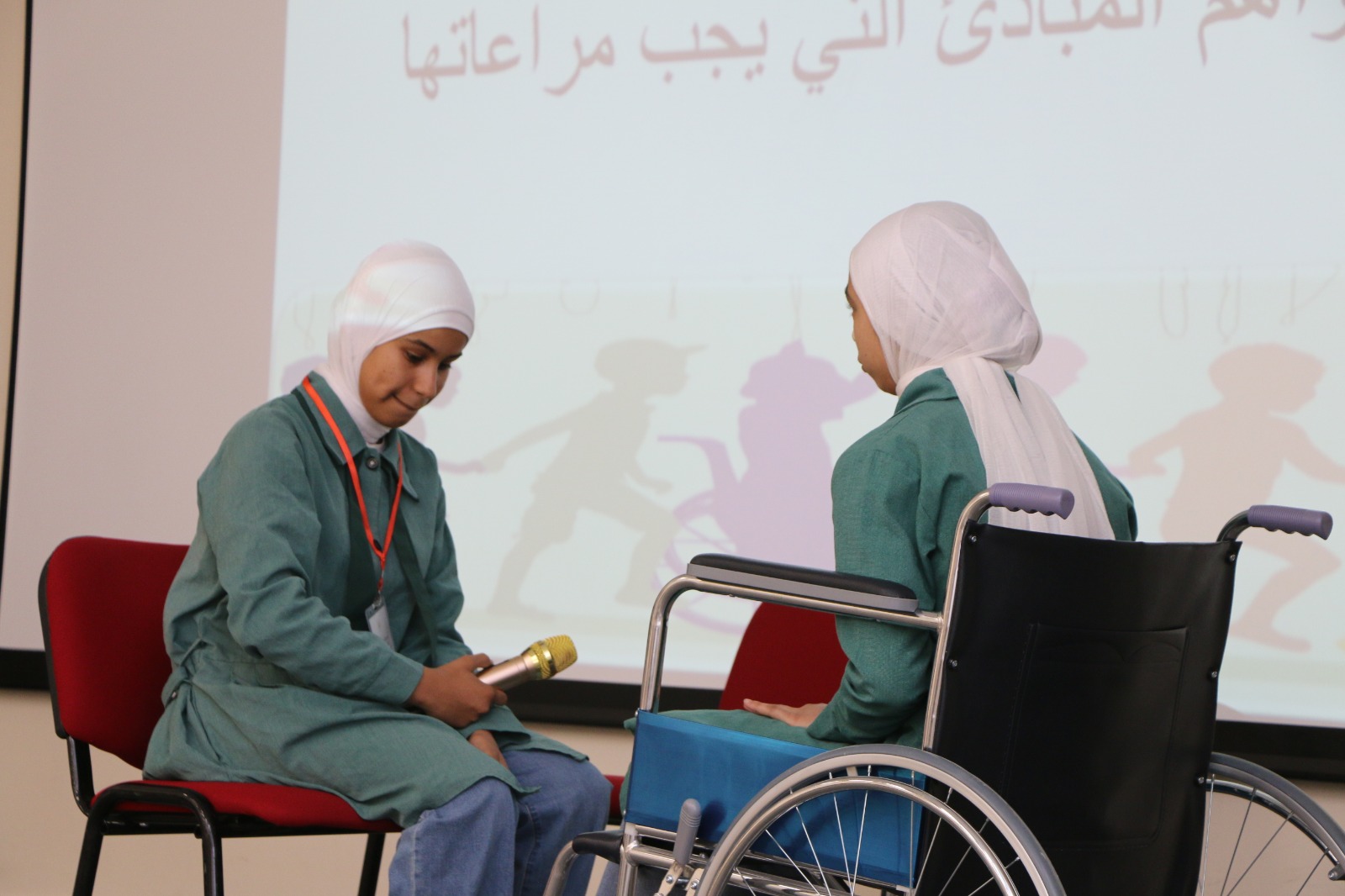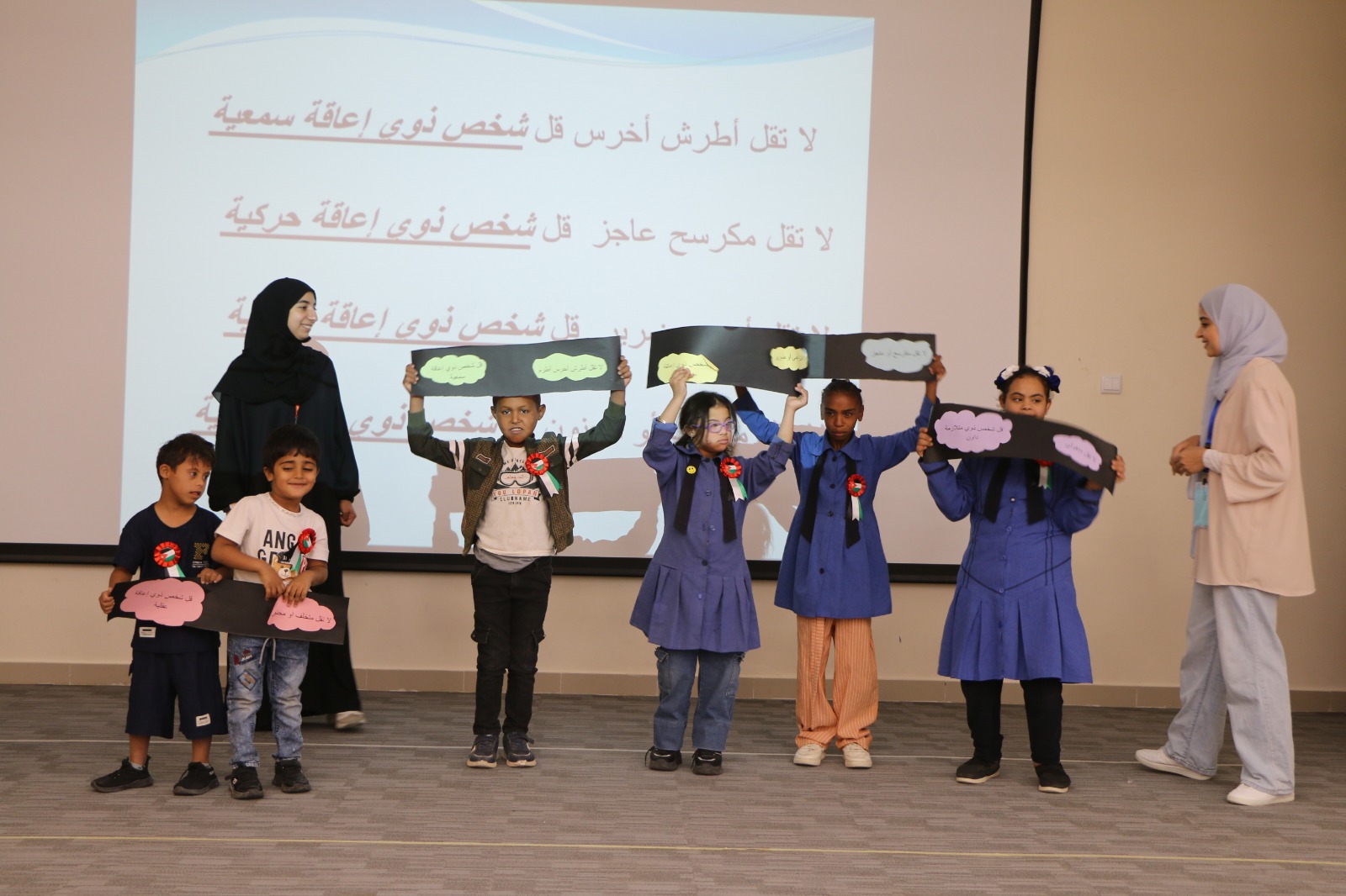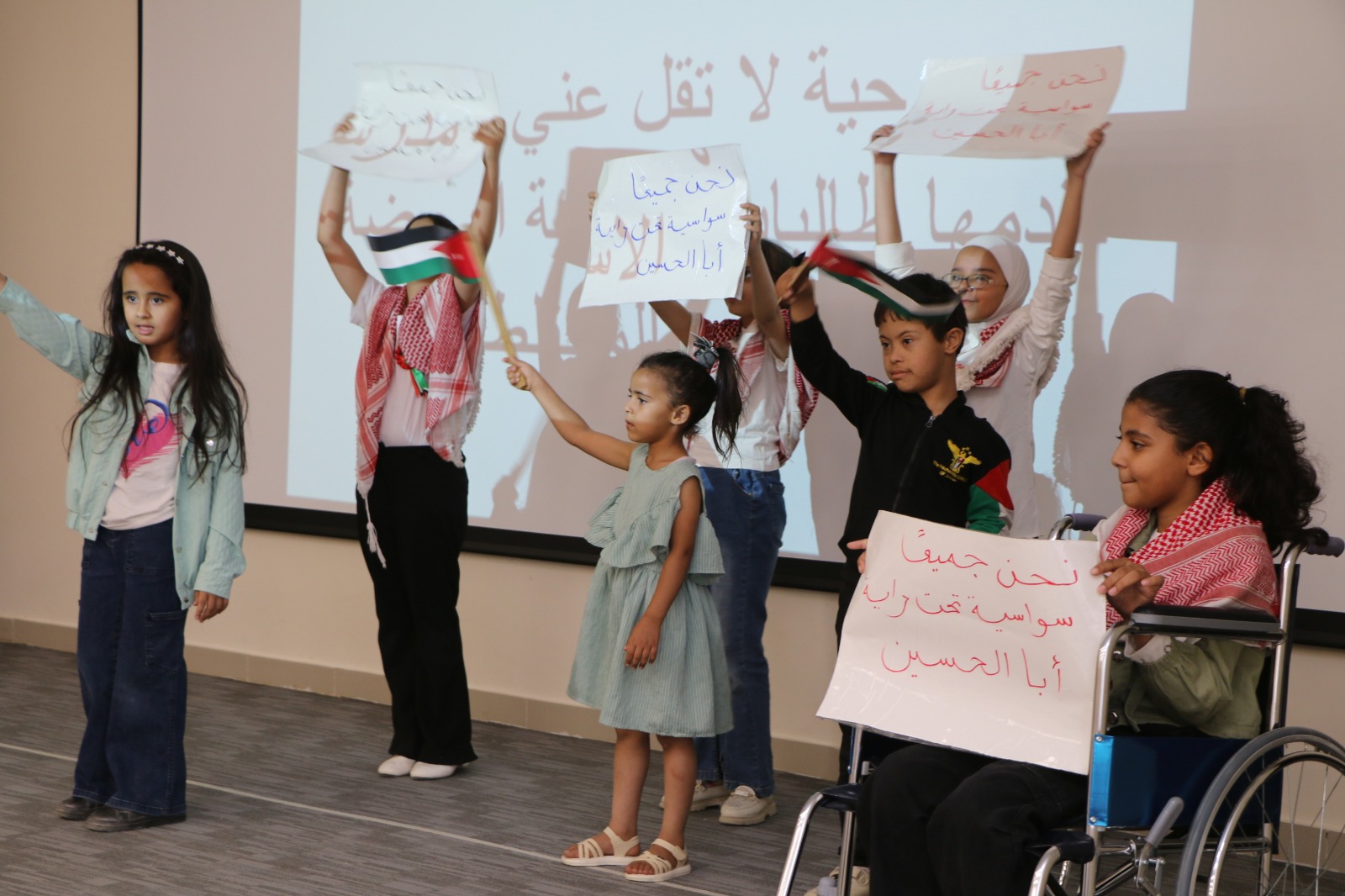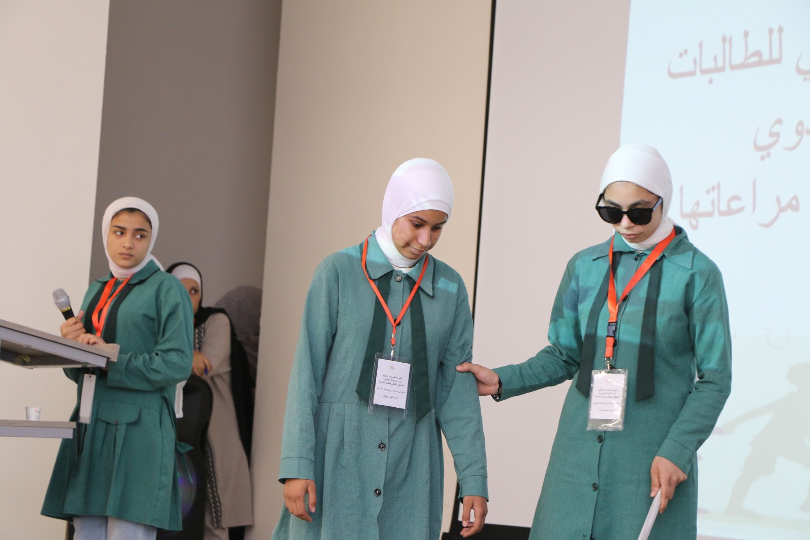 كما قدم الطلبة عروضاً مسرحية توعوية، تضمنت تجربة حسّية للتعامل مع طلبة التعليم الدامج، قدمتها مدرسة حي السراهدة، ومسرحية توعوية أخرى قدمها طلبة مدرسة الروضة الأساسية المختلطة، لتعزيز الوعي المجتمعي بأهمية الدمج.