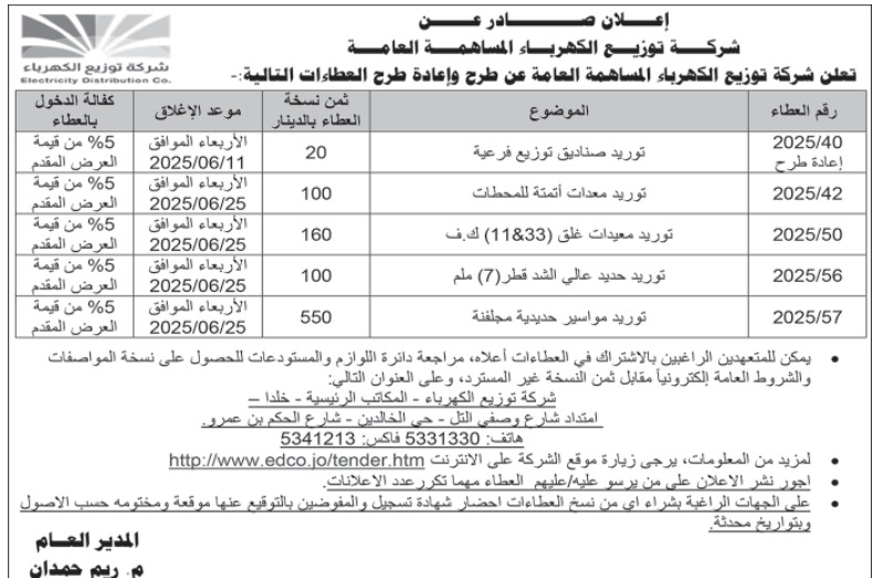 عطاءات صادرة عن شركة توزيع الكهرباء
