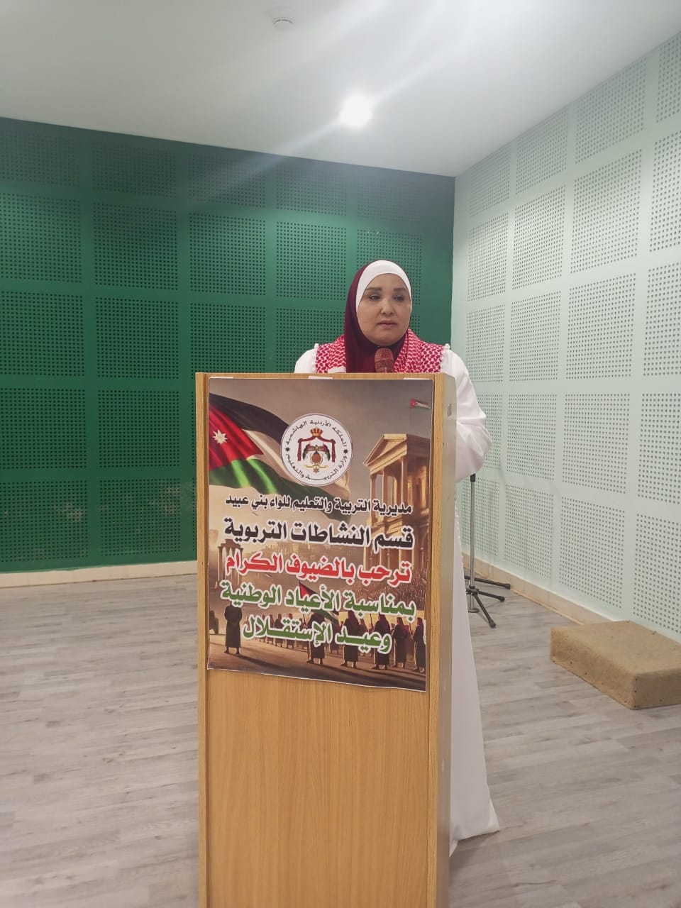 واستهل الاحتفال بالسلام الملكي وآيات عطرة من القرآن الكريم، والقت مديرة التربية كلمة رحبت خلالها بجميع الحضور الكريم، متحدثةً عن أهمية الاحتفالات بالأعياد الوطنية ومن ضمنها عيد الاستقلال والتي ترسخ مفاهيم الوطنية المطلقة، مؤكدة على وقوف الاسرة التربوية كافة خلف القيادة الهاشمية بقيادة جلالة الملك عبدالله الثاني ابن الحسين، وتجديد الولاء والبيعة، وعلى العهد ماضون، في استقرار يعمه الامن والأمان.