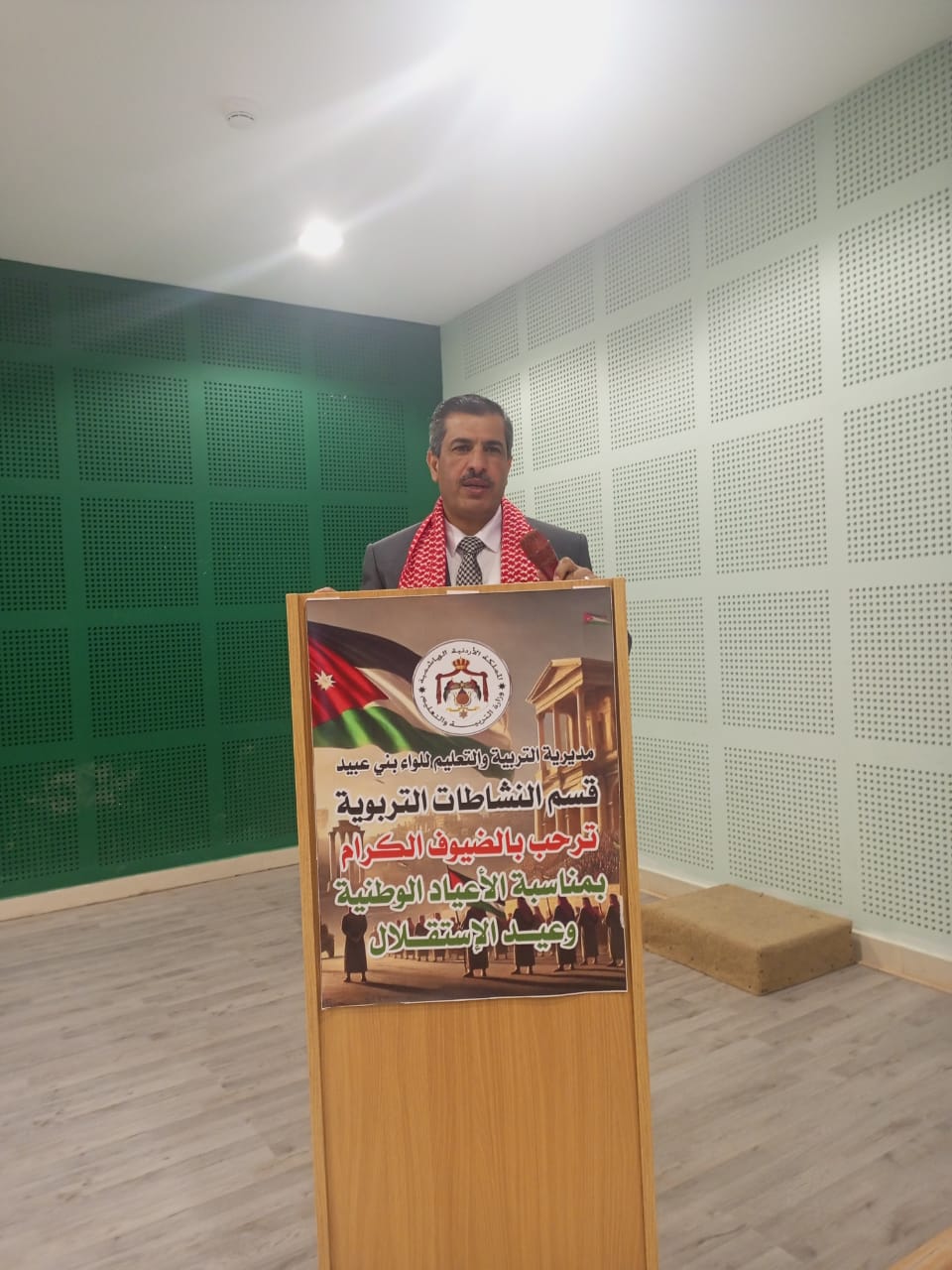 عمون - برعاية متصرف لواء بني عبيد الدكتور علي الحوامده، اقامت مديرية التربية والتعليم للواء بني عبيد - قسم النشاطات التربوية ممثلة بمديرة التربية والتعليم السيدة نسرين البكار، اليوم احتفالاً بمناسبة عيد الاستقلال التاسع والسبعين، وبحضور رئيس مركز أمن بني عبيد المقدم عمر العجارمه، ونواب وممثلين من مختلف المؤسسات الحكومية والمجتمع المحلي، وحضور مديرة التربية والتعليم للواء قصبة اربد المهندسة هدى شطناوي، ومديرة التربية والتعليم للواء المزار السيدة اميمه المصري، والمدراء المختصون، ورؤساء وأعضاء من شبكات مجلس التطوير التربوي، ورؤساء أقسام وأعضاء وموظفي المديرية، ومديرات ومدراء المدارس الحكومية والخاصة وعدد من المعلمين والطلاب، وذلك على مسرح مدرسة حفصة بنت عمر الأساسية المختلطة.