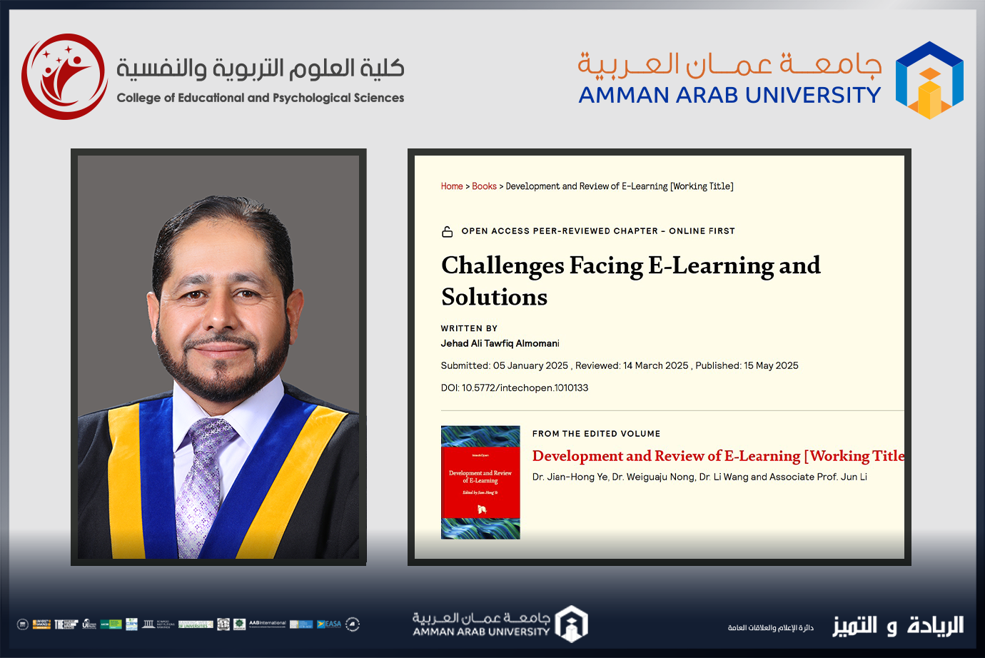 عمون - نشر الدكتور جهاد المومني عضو هيئة التدريس في جامعة عمان العربية / كلية العلوم التربوية والنفسية فصلاً في كتاب عالمي بريطاني يحمل عنوان " Development and Review of E-Learninوالذي صدر عن دار النشر العالمية intechopen والمفهرسة في قواعد بيانات Web of Science في لندن – بريطانيا، حيث جاء الفصل المنشور بعنوان Challenges Facing Elearning and Solutions ".