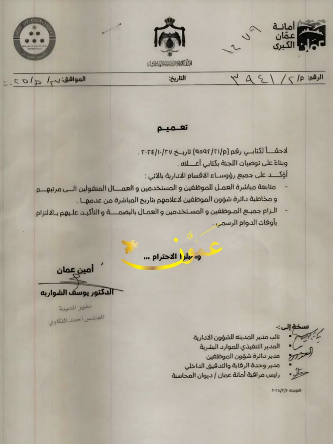 أمين عمان يلزم الموظفين والمستخدمين والعمال ببصمة الدوام28-05-2025 02:32 PM