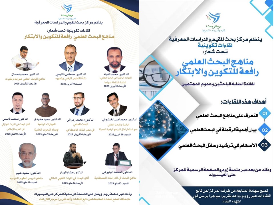 عمون - نظم مركز بحث للقيم والدراسات المعرفية سلسلة لقاءات تكوينية تحت شعار: "مناهج البحث العلمي، رافعة للتكوين والابتكار"، لفائدة الطلبة الباحثين وعموم المهتمين، وبُثت هذه اللقاءات عبر الوسائط الرقمية للمركز في الفترة من 16 ابريل إلى 17 ماي 2025، ووفق المركز، فإن هذه التظاهرة العلمية تروم التعرف على مناهج البحث العلمي، وبيان أهمية الرقمنة في هذا البحث، إضافة إلى تقديم مساهمات في ترشيد وسائله.