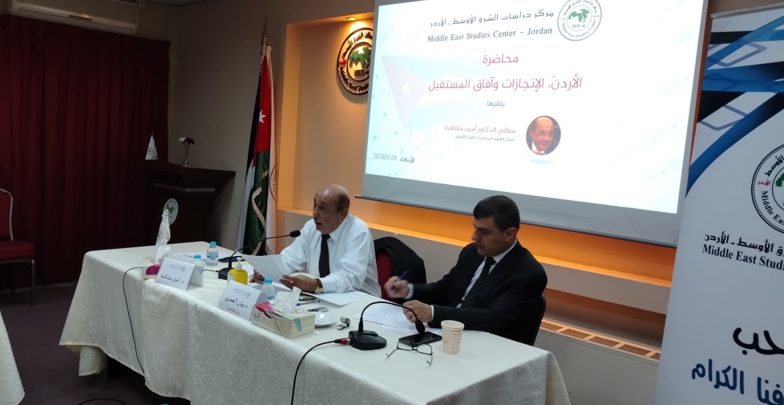 عمون - في ظلال الاحتفالات الوطنية بالذكرى التاسعة والسبعين لاستقلال المملكة الأردنية الهاشمية، عقد مركز دراسات الشرق الأوسط مساء الأربعاء 28/5/2025، محاضرة بعنوان "الأردن، الإنجازات وآفاق المستقبل"، استضاف خلالها أستاذ العلوم السياسية ووزير التنمية الاجتماعية الأسبق الدكتور أمين مشاقبة، بحضور خبراء ومسؤولين سابقين ونخبة من المثقفين.