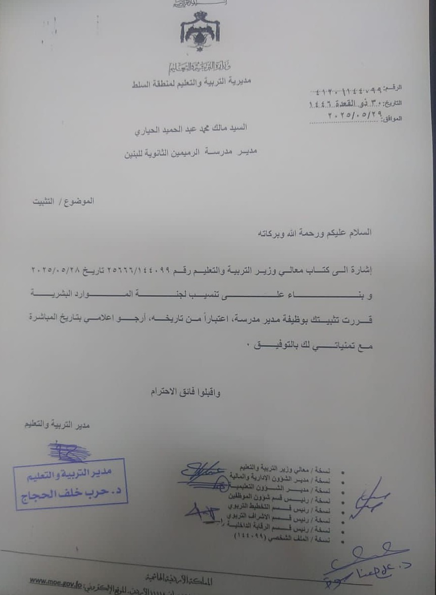 عمون - قرر مدير التربية والتعليم لمنطقة السلط، حرب الحجاج، تثبيت مدير مدرسة الرميمين الثانوية للبنين مالك محمد الحياري، مديرا للمدرسة.