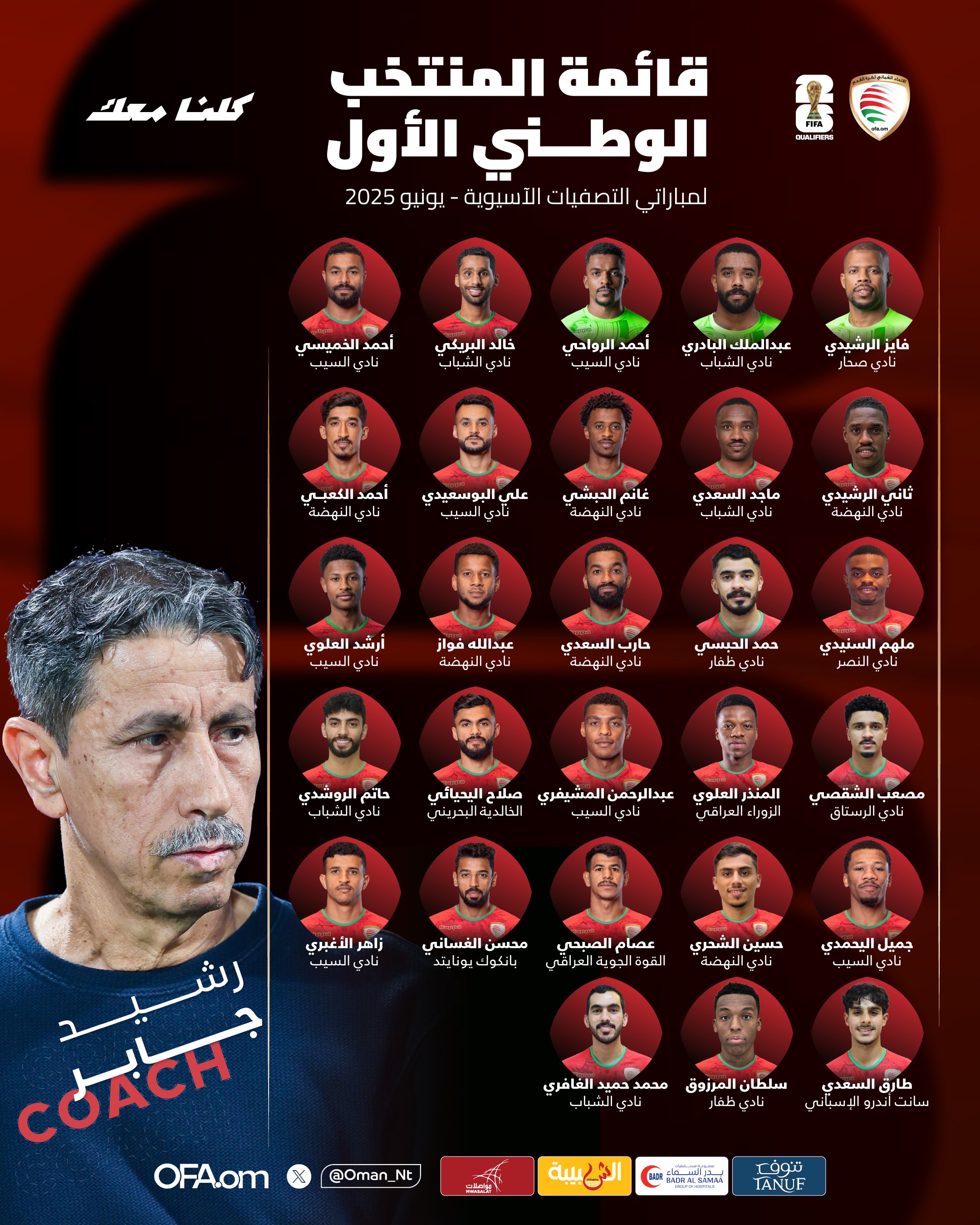 عمون - أعلن المدرب رشيد جابر اليوم الجمعة عن القائمة النهائية لمنتخب عُمان التي ستواجه الأردن وفلسطين في تصفيات آسيا المؤهلة لكأس العالم 2026، حيث ضمت 28 لاعباً.