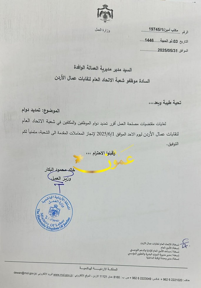 عمون - قرر وزير العمل خالد البكار تمديد دوام الموظفين والمكلفين في شعبة الاتحاد العام لنقابات عمال الاردن ليوم الأحد الموافق 1/6/2025. |