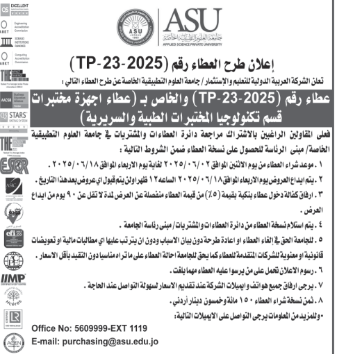 عطاء صادر عن جامعة العلوم التطبيقية الخاصة