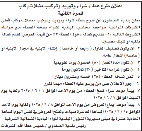 عطاء شراء وتركيب مظلات ركاب لبلدية الصفاوي