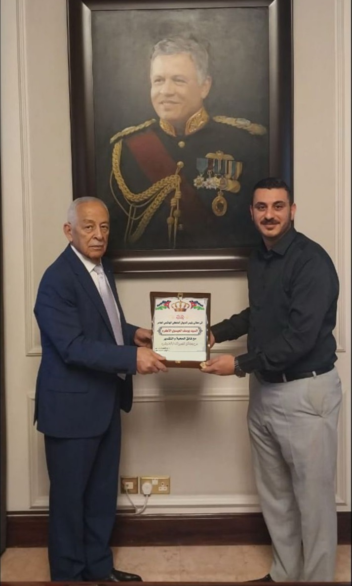 بفضل الله وتوفيقه، سعدت بلقاء معالي السيد يوسف العيسوي، رئيس الديوان الملكي الهاشمي، حيث كان لي الشرف بتقديم درع رمزي لمعاليه تعبيرًا عن التقدير لجهوده الطيبة في خدمة الوطن وشبابه، وتواضعه الذي يجسّد نهج القيادة الهاشمية.