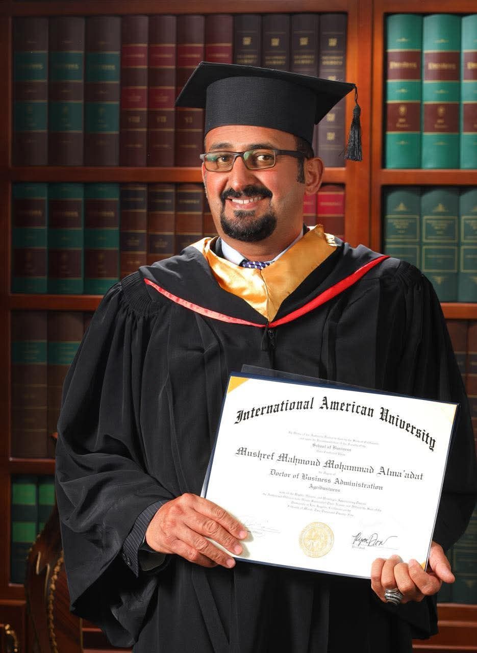 عمون - يتقدم السيد أبو عبد الكريم الحديدي، بأجمل التهاني والتبريكات للزميل الدكتور مشرف المعادات بحصوله على درجة الدكتوراة تخصص إدارة الأعمال الزراعية من الجامعة الأمريكية الدولية .
