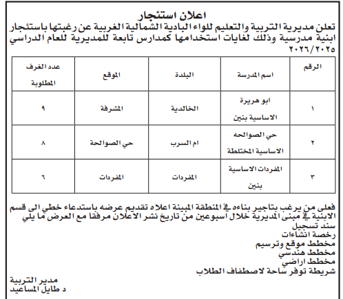 عطاء استئجار ابنية مدرسية لمديرية تربية وتعليم لواء البادية الشمالية
