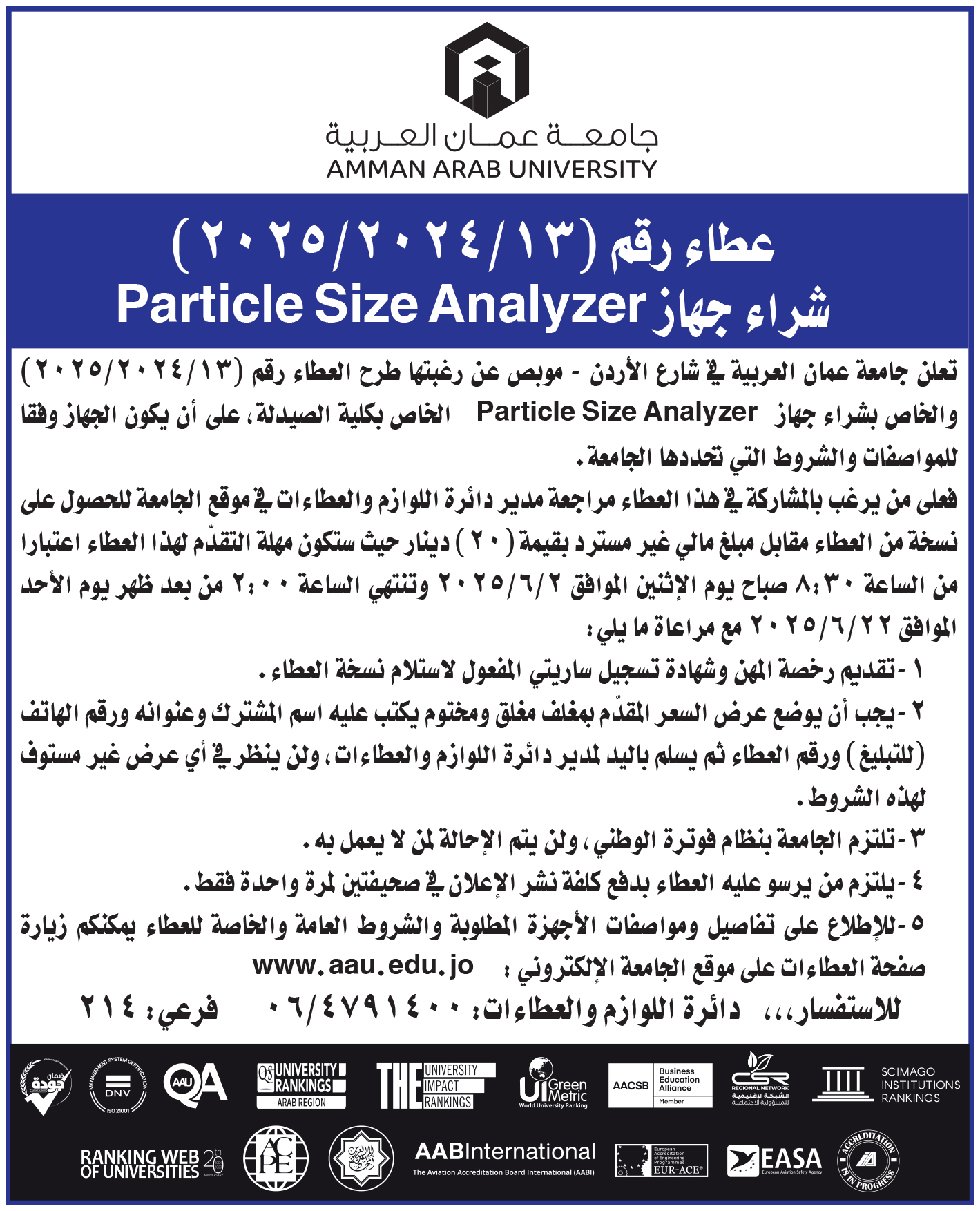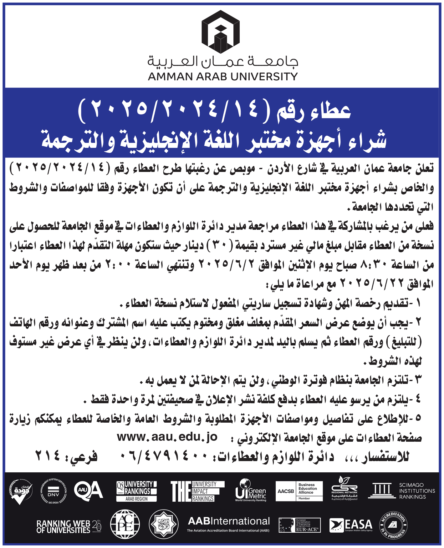 عطاءات صادرة عن جامعة عمان العربية