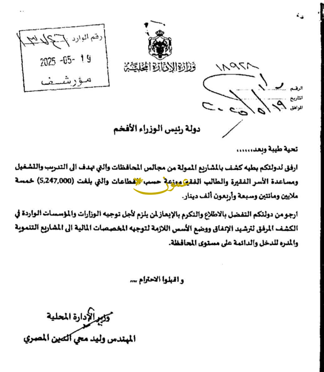 عمون -ينال المعاني- أوعز رئيس الوزراء الدكتور جعفر حسان، الى وقف تنفيذ المشاريع الممولة من موازنات مجالس المحافظات والتي تهدف الى التدريب والتشغيل ومساعدة الاسر الفقيرة والطالب الفقير والتي بلغت خمسة ملايين ومائتين وسبعة واربعون الف دينار. |